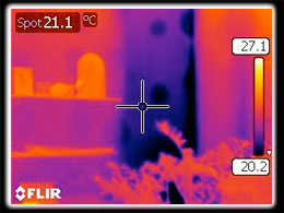 Мухълът в пода се вижда на термалното изображение в лилав цвят. |